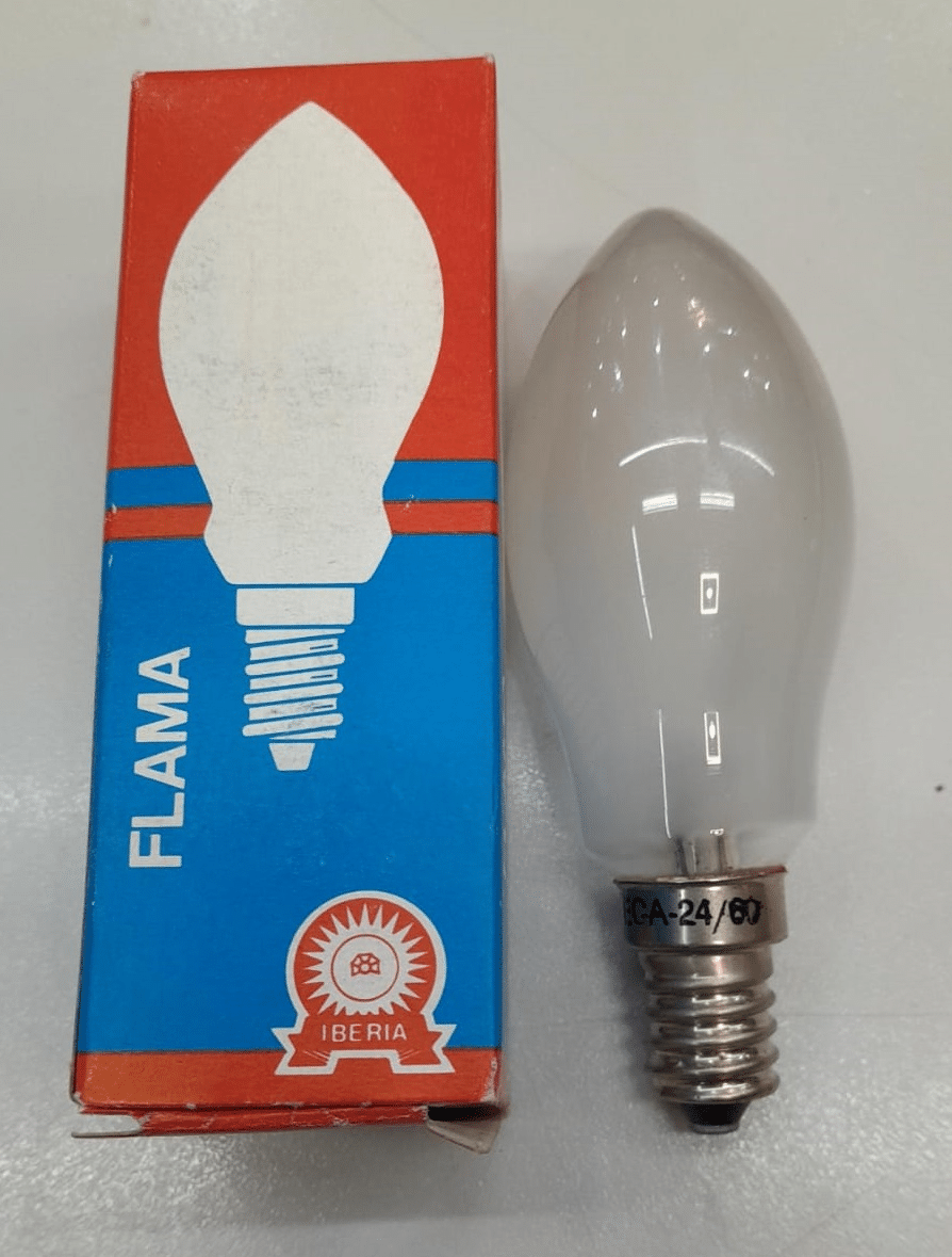 Bombilla Tipo Vela Cristal Mate y casquillo E-14 , funciona a 24V con 60W, coon una dimensiones de 35x95Hmm.