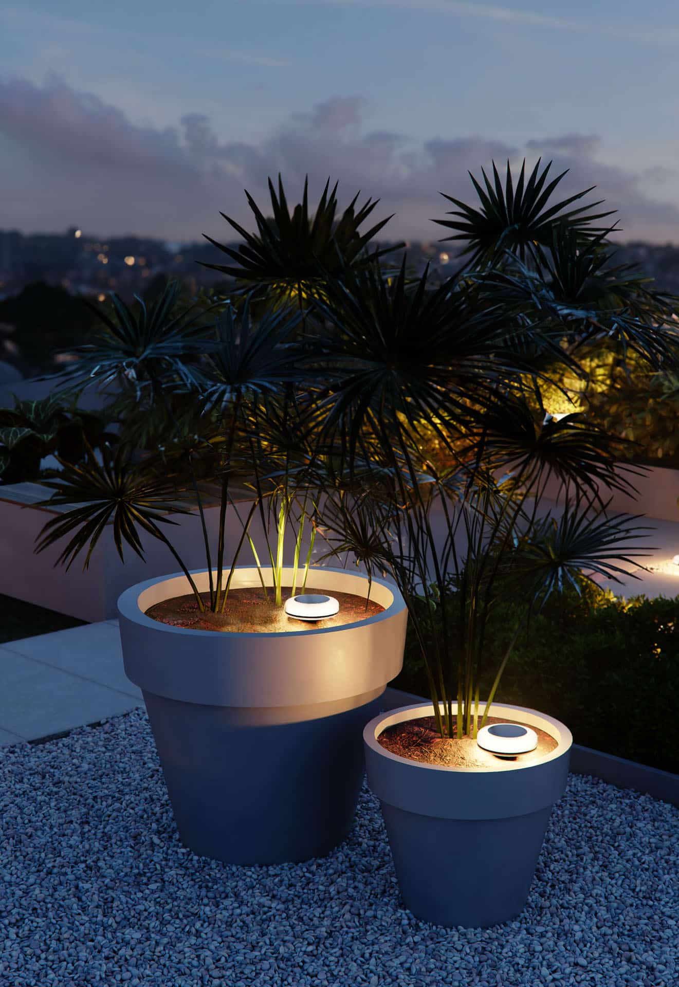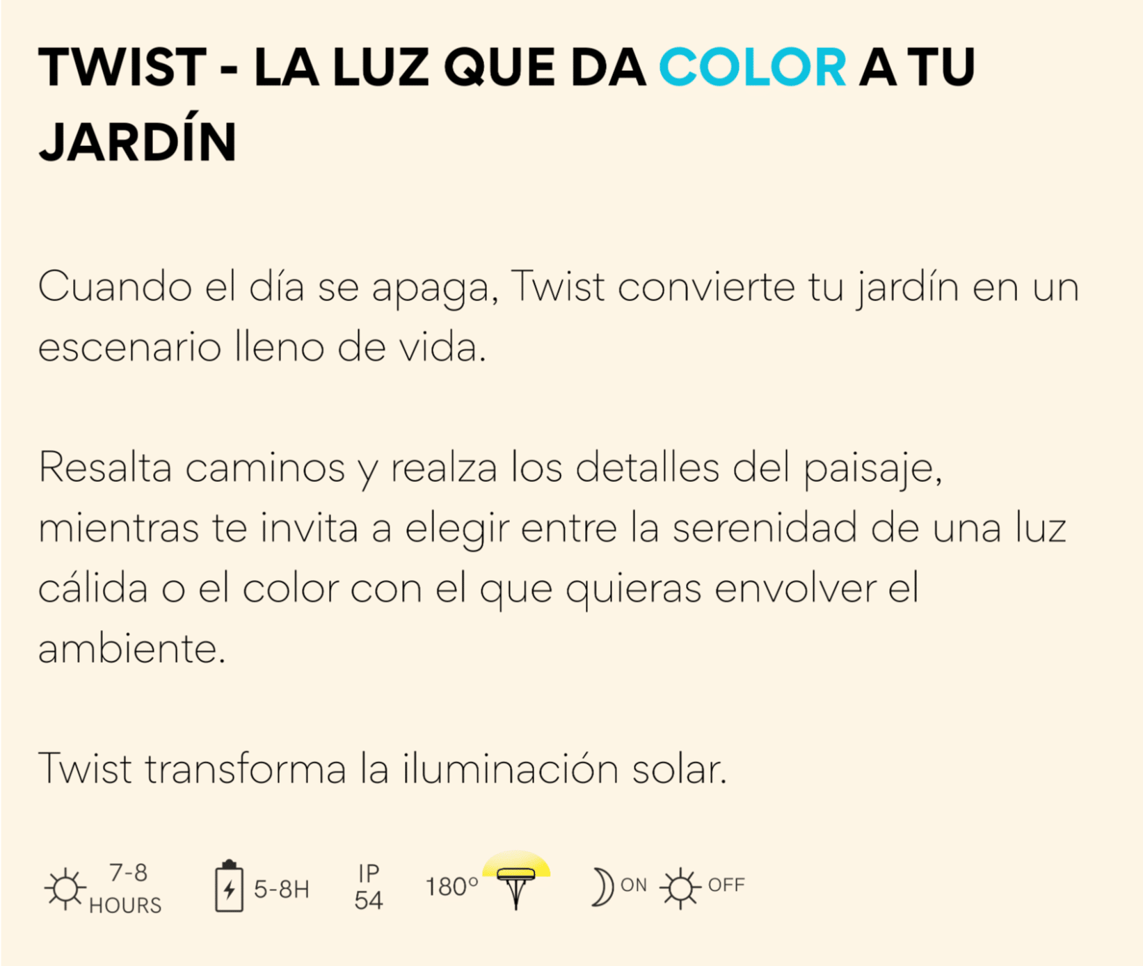 El día se despide y Twist despierta en el jardín. Cargándose bajo el sol, al caer la noche ilumina caminos y rincones con una luz cálida que puede transformarse en un juego de colores RGB. Cada cambio crea un suave movimiento que llena de vida cada espacio exterior, invitando a relajarse y disfrutar de la magia de la luz.