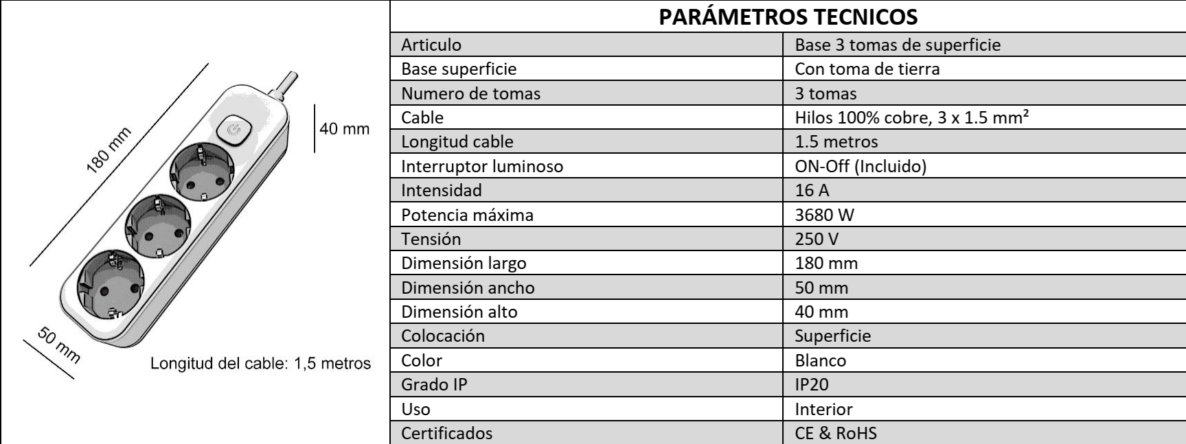 BASE MULTIPLE 3 TOMAS CON INTERRUPTOR 1.5 METROS BLANCA